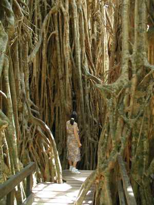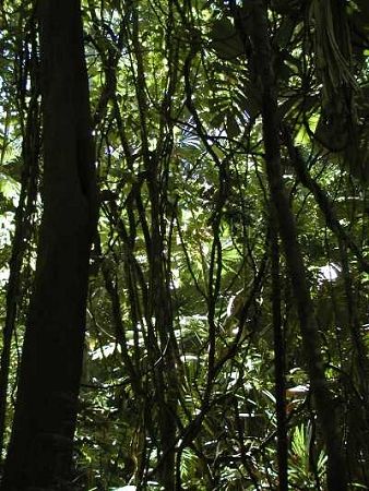 Ein solcher Spaziergang ist nur auf angelegten Wegen möglich, sonst gibt es kein Durchkommen: Manche Pflanzen haben messerscharfe Blattränder, an denen man sich tiefe Schnittwunden holen kann. Andere halten einem mit ihren Widerhaken fest und wieder andere brennen so stark (stinging tree), dass man nach Berührung wochenlange starke Schmerzen ertragen muss. Hinzu kommt, dass gerade am Waldboden viele giftige Tiere leben, zum Beispiel Schlangen oder Spinnen. |