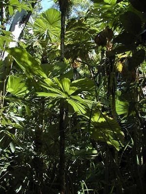 Ein tropischer Regenwald ist ein nahezu undurchdringliches Dickicht mit zahlreichen Schlingpflanzen, Lianen, Epiphyten, Würgefeigen, Palmen und riesigen Urwaldbäumen mit meterhohen Brettwurzeln. Alle Pflanzen versuchen, mit vielen Tricks ans Licht zu kommen, das es in ausreichender Menge nur im Kronenbereich der Bäume gibt. Am Boden des Waldes kommt nur noch 1 Prozent des Lichtes an. Der Wald ist immergrün, Blüten, Früchte, Wachstum und fallende Blätter gibt es das ganze Jahr über. |